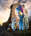 The world-famous mural titled "Saint Mungo" (though also known as Modern Day Mungo). It is located in Glasgow, Scotland, specifically on a gable end building on High Street, near Glasgow Cathedral. ???? The Artist and Style The mural was created in February 2016 by the renowned Australian street artist Sam Bates, who goes by the name Smug. It is part of the Glasgow City Centre Mural Trail, a collection of nearly 30 large-scale artworks designed to revitalize the city's streets. Smug is celebrated for his hyper-realistic style, which he achieves primarily using spray paint. ???? Meaning and Symbolism The mural is a contemporary reimagining of Saint Mungo, the patron saint and founder of Glasgow. * The Modern Figure: Instead of traditional religious robes, the saint is depicted as a modern-day Glaswegian in an anorak. Some interpret his appearance as that of a homeless man to reflect contemporary social issues and humanize the saint’s message of compassion. * The Robin: The bird on his finger refers to one of Saint Mungo's four legendary miracles: "The bird that never flew". According to legend, Mungo restored life to a pet robin that had been accidentally killed by his classmates. * The Halo: A subtle, glowing circle behind his head serves as a "discrete halo," signifying his saintly status despite his humble modern clothing.