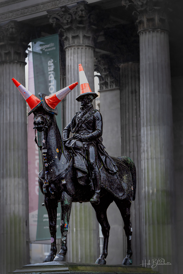The Equestrian Statue of the Duke of Wellington, located on Queen Street outside the Gallery of Modern Art (GoMA) in Glasgow. While it was built to honor a military hero, it has become a global symbol of Glasgow’s unique sense of humor. The History and the "Tradition" * The Subject: The statue depicts Arthur Wellesley, the 1st Duke of Wellington, who famously defeated Napoleon at the Battle of Waterloo. It was sculpted by Italian artist Carlo Marochetti and erected in 1844. * The Cone: For over 40 years, locals have engaged in a "tradition" of climbing the statue to place an orange traffic cone on the Duke's head. As your image shows, the horse often gets its own "ears" (cones) as well! * The Symbolism: What started as a late-night prank has evolved into a symbol of the city. It represents the "Glaswegian" spirit—irreverent, defiant of authority, and ready to laugh at even the most serious subjects. The Battle for the Cone The cone hasn't always been welcomed by officials. Here is how it became a permanent fixture: | Era | Status | |---|---| | Pre-2013 | The City Council and Police spent thousands of pounds every year using cranes to remove the cones, only for them to reappear days later. | | The 2013 Protest | The Council proposed a £65,000 plan to double the height of the plinth to stop people from climbing it. This sparked a massive "Keep the Cone" campaign and a petition with over 10,000 signatures. | | Today | The authorities eventually surrendered. The cone is now rarely removed, and the statue is frequently listed by Lonely Planet and TripAdvisor as one of the most bizarre or "top" landmarks in the world. | Global Recognition * The 2014 Commonwealth Games: During the games held in Glasgow, the statue (with its cone) featured prominently in the opening ceremony and official merchandise. * Banksy's Endorsement: In 2023, the world-famous street artist Banksy held an exhibition at the GoMA right behind the statue. He called it his "favorite artwork in the UK" because of the community’s dedication to keeping the cone in place.