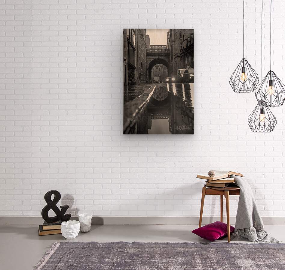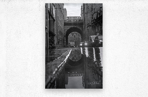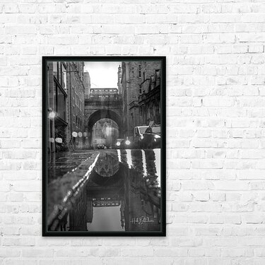 This striking black-and-white image captures George IV Bridge in Edinburgh, viewed from the lower level of Merchant Street. Architecture and History * The Bridge Structure: George IV Bridge is actually an elevated street supported by a series of massive stone arches. It was constructed between 1827 and 1836 as part of a major city improvement project to connect the Old Town to the south of the city. * Split-Level Design: Your photo highlights Edinburgh's unique multi-layered architecture, where streets literally run on top of one another. The archway you are looking through supports the main road above, while the street you are standing on provides access to the lower levels of the historic tenements. * The Ghost Bus: Perfectly timed in the reflection and on the bridge itself is "The Ghost Bus," a popular themed tour that explores Edinburgh's dark and macabre history. Location Context * Greyfriars Bobby: Just at the top end of this bridge sits the famous statue of Greyfriars Bobby and the entrance to the historic Greyfriars Kirkyard. * Literary Links: The bridge is also home to the National Library of Scotland and is a short walk from the Elephant House café, often cited as a birthplace of the Harry Potter series. * The Vaults: Some of the arches nearby, like those under South Bridge, contain the famous Edinburgh Vaults, which were once used as storage, workshops, and even illicit housing in the 18th century.
